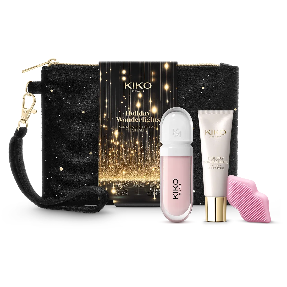 Conjunto de presente de cuidados para os lábios composto por um esfoliante para os lábios, um aplicador e um creme aperfeiçoador labial com efeito volumizador, dentro de uma mini pochete requintada.