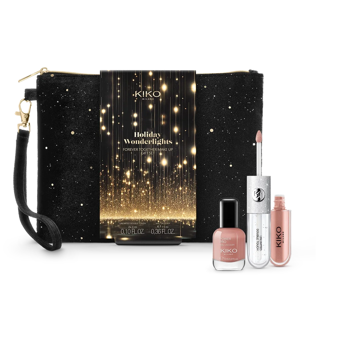 Conjunto de maquiagem constituído por um batom líquido brilhante e um verniz de unhas a efeito lustroso numa pochete preciosa.O conjunto contém:- No. 1 Unlimited Double TouchUm produto 2 em 1, um verdadeiro ritual para os lábios: batom líquido de longa duração* e sem transferência de um lado e um gloss transparente do outro, para iluminar os lábios com cor e um brilho espelhado.- N.º 1 New Power Pro Nail LacquerVerniz de unhas com uma fórmula com alta concentração de pigmentos que garante um resultado uniforme e um cor intensa e rica, com um efeito superbrilhante.- N.º 1 Pochete para maquiagem e acessóriosPrática e elegante, é feita em tecido com efeito de veludo preto e decorada com uma cascata de detalhes dourados brilhantes. Formato retangular, fechamento em zíper e alça para o pulso.Ideal para:valorizar os lábios e as mãos com um visual para os lábios e manicure impecáveis, combinando e incrivelmente brilhantes. O presente perfeito.